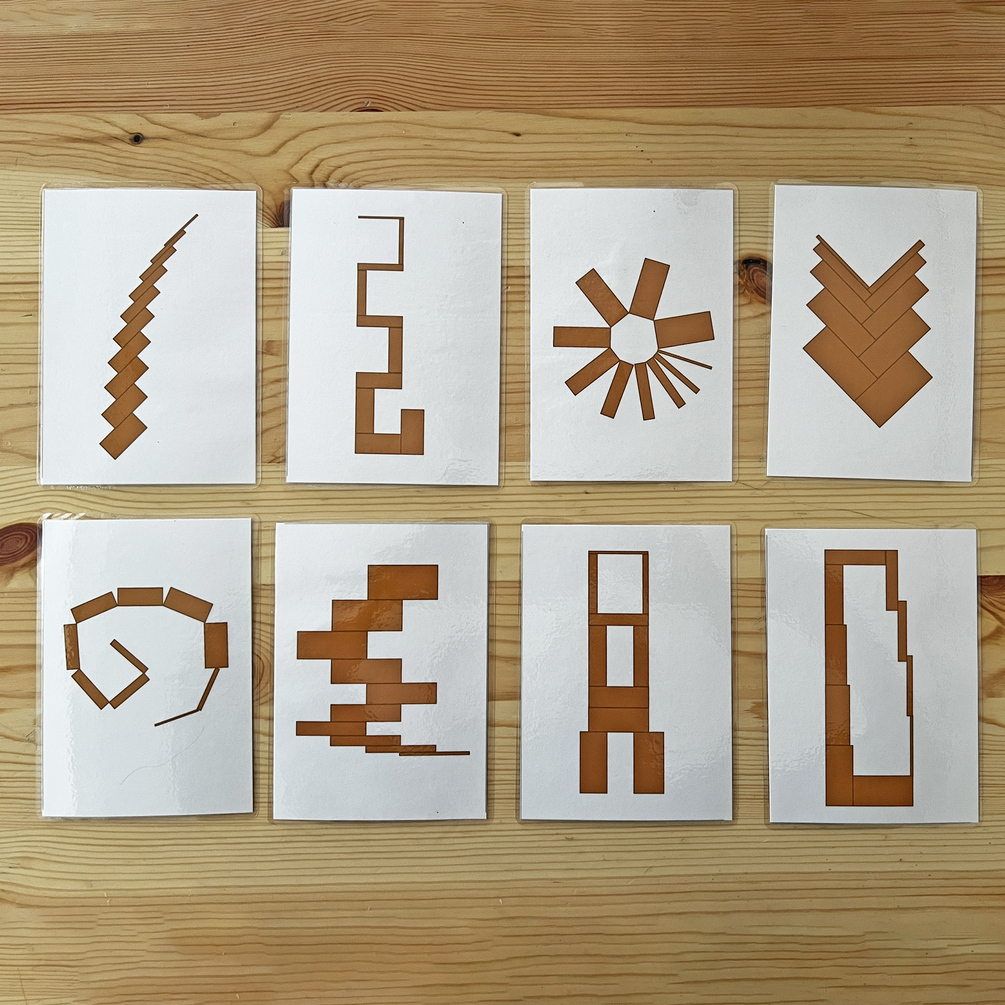 Some of the cards challenge children to translate a flat, two-dimensional image into a three-dimensional vertical construction using the actual materials. Converting a flat image into a spatial structure requires advanced spatial awareness and can be quite challenging for children. For these activities, adult support is recommended. Younger children, in particular, benefit from working together with an adult, receiving gentle guidance and encouragement as they explore more complex constructions.
