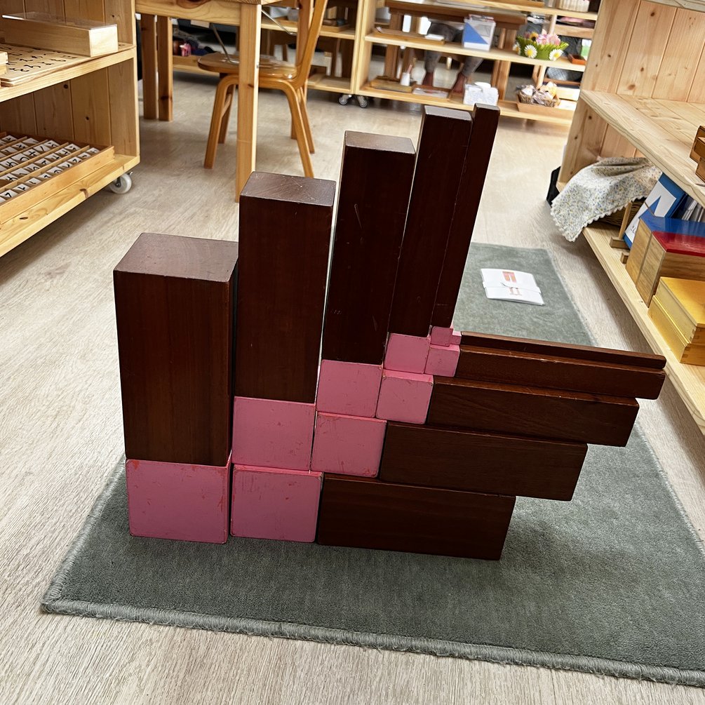 At the same time, the Pink Tower and Brown Stair are materials that continue to grow with the child. By using these pattern cards, children are invited to explore new ways of arranging, combining, and constructing shapes. Variations such as working from pattern cards or using blindfolded activities allow older children to deepen and refine their sensorial experiences, making these materials engaging well into the kindergarten years.